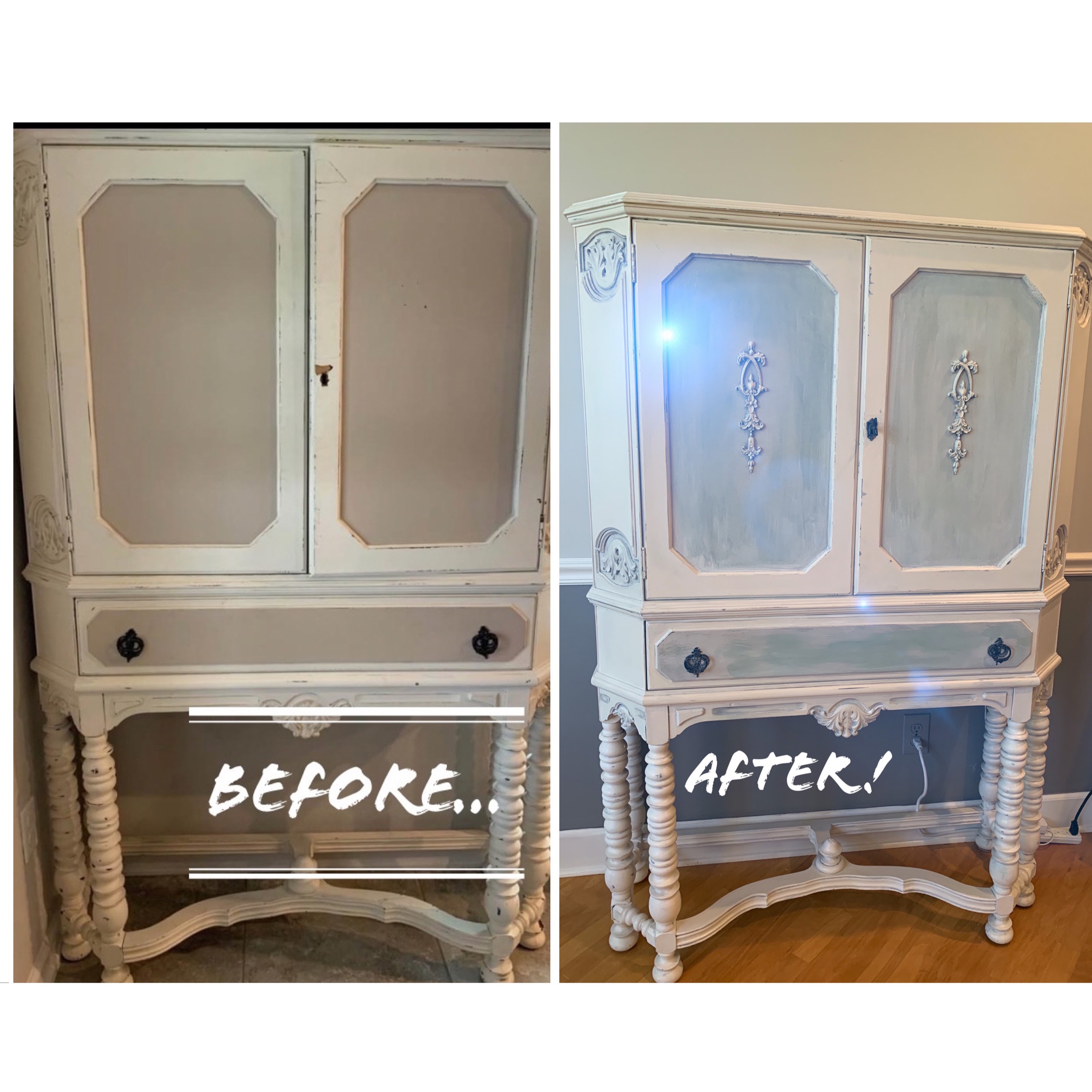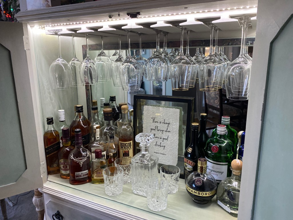 So, I added a $5 mirror from a second-hand store (which I refurbished the frame to lighten it yet let its pretty design show through), some wine glass holders ($15 each, painted and attached to the top) and a light strip along the top inside of the cabinet. Then I added a little extra touch on the door front, feeling she deserved a little something fancy front and center. Now she has a prominent place and function in our home!
