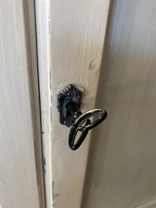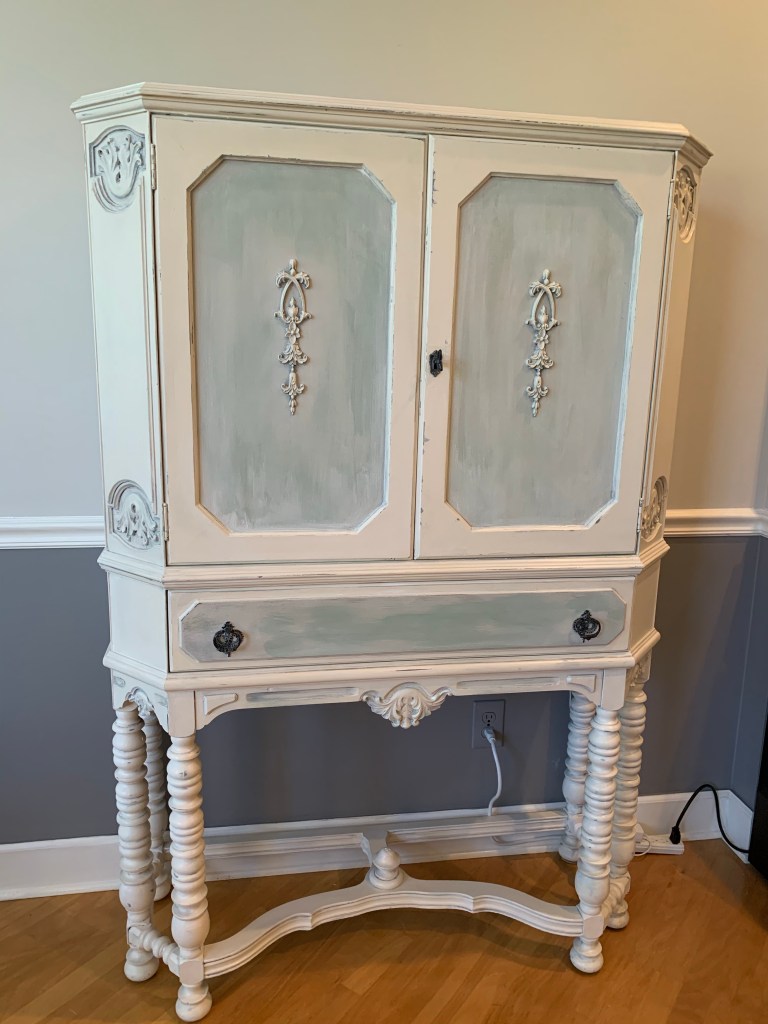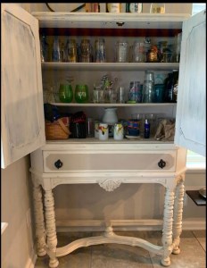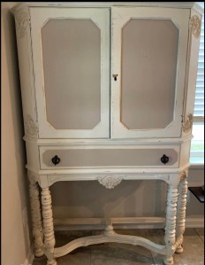 With the help of a little air freshening device inside the drawer for a month or so, I’m happy to say this gal no longer stinks. She got a do-over in life! Now she smiles and curtsies bashfully when people rave about how lovely she is. She is glad to serve a purpose—to hold and present items that we and our visitors seem to enjoy. She is hospitable, bright, and, one more little thing—she can lock up at night!